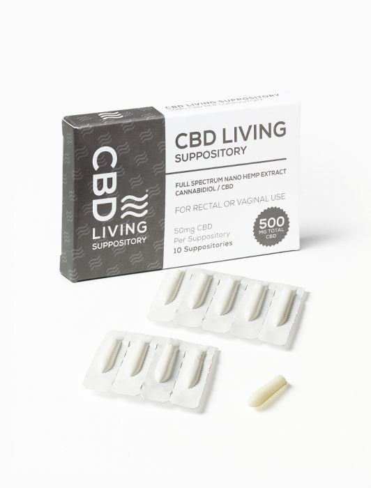 Each box of CBD Living Suppositories contains 10 – 50 mg suppositories.
